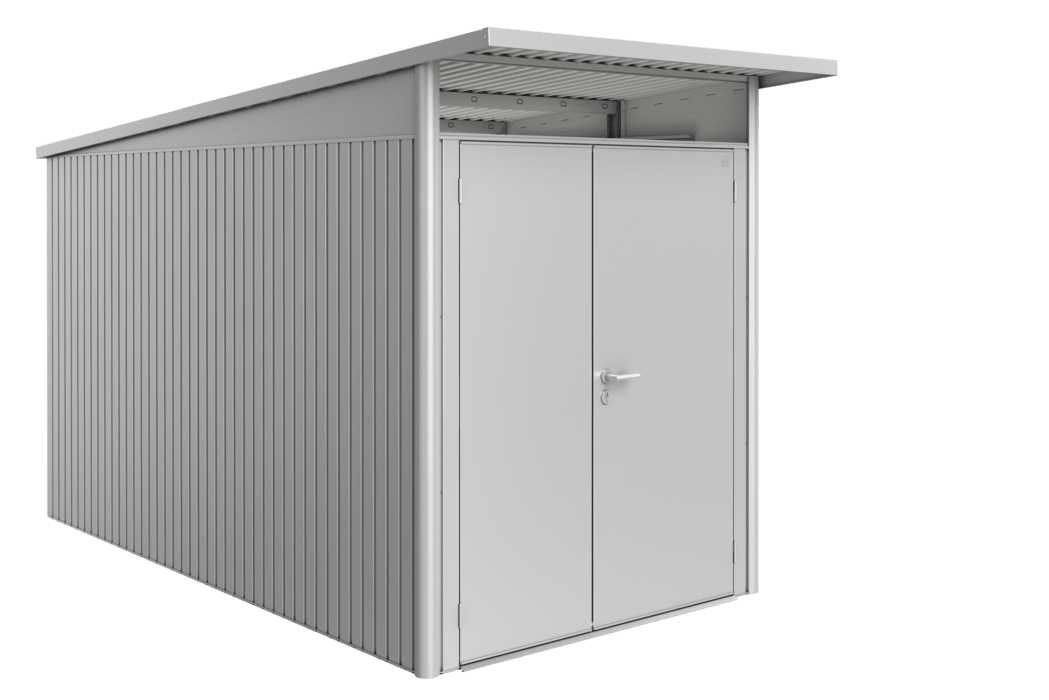 Biohort Avantgarde A4 plechový domček - dvojkrídlové dvere 180 x 380 x 222 cm, strieborný metalický