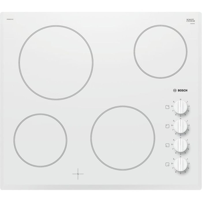 Sklokeramická varná doska Bosch PKE652CA1E v bielom prevedení ,so 4 varnými zónami HighSpeed. Ovládanie je umiestnené naboku prostredníctvom otočných gombíkov. K dispozícii je 9 stupňov výkonu a 4 ukazovatele zbytkového tepla. Šírka 60 cm. U-fazeta: elegantný design s fazetou vpredu a po bokoch.