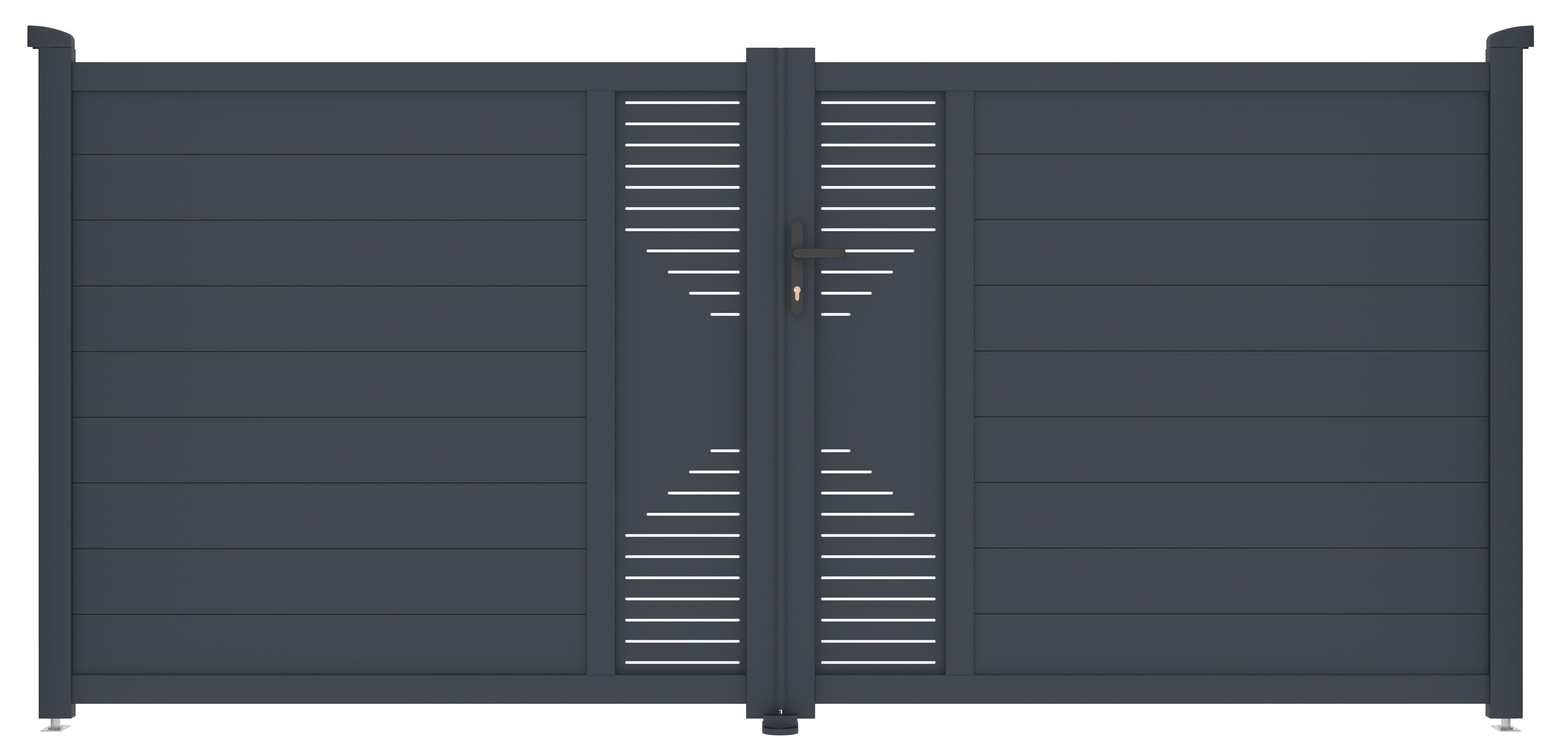 : G21Vjazdová hliníková dvojkrídlová brána s prípravou na montáž elektrického otvárania. Kľučka, FAB zámok, otváranie dovnútra, vysoká odolnosť a dlhá životnosť, práškový nástrek, možnosť prispôsobenia šírky na mieru.