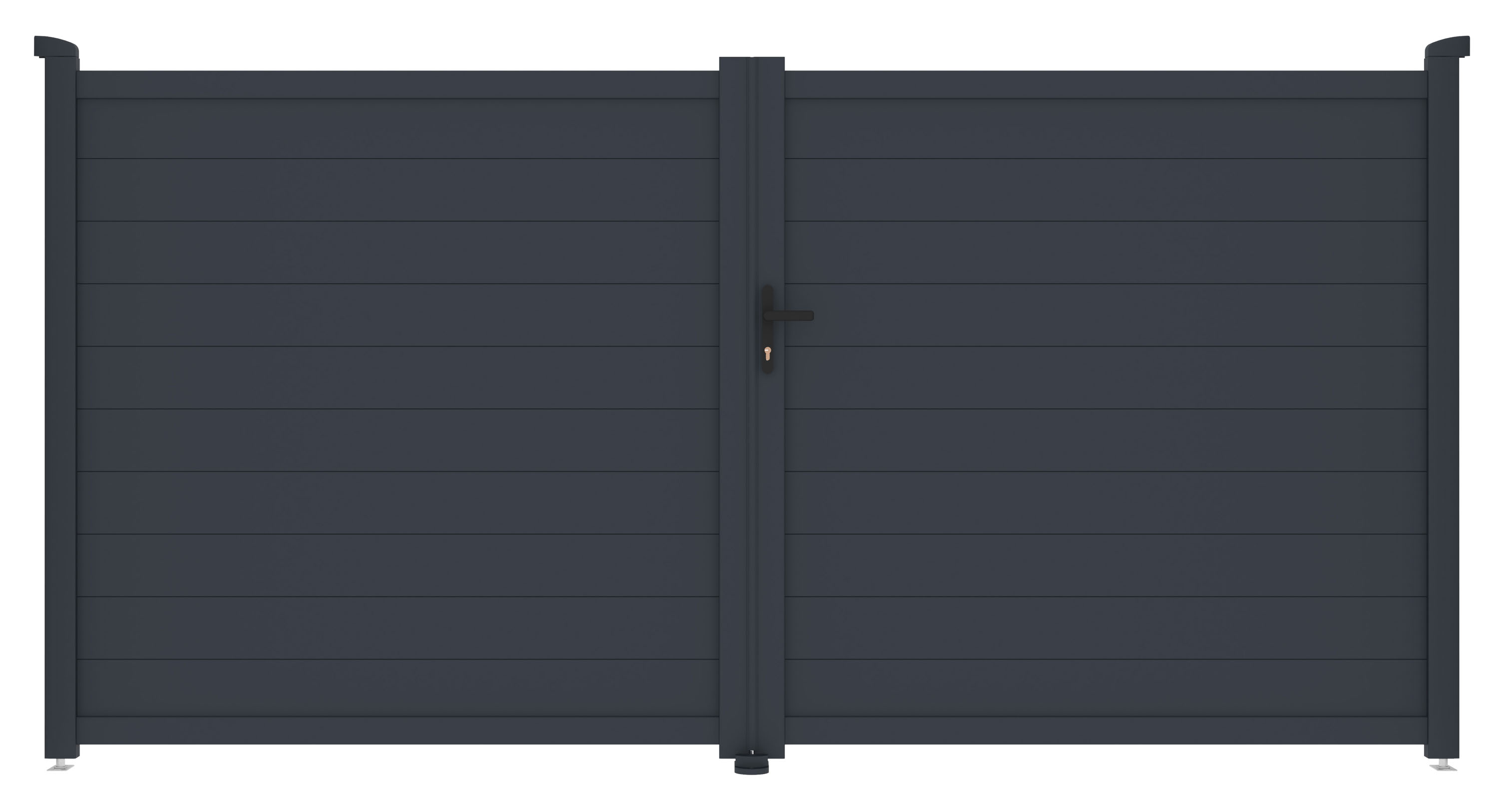 : G21Vjazdová hliníková dvojkrídlová brána s prípravou na montáž elektrického otvárania. Kľučka, FAB zámok, otváranie dovnútra, vysoká odolnosť a dlhá životnosť, práškový nástrek, možnosť prispôsobenia šírky na mieru.