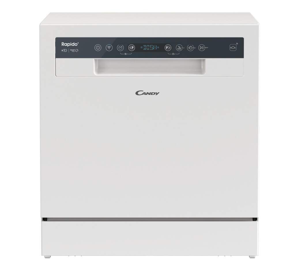 : CandyVoľne stojaca stolová umývačka riadu Candy CP 8F9FFW Rapidó v bielej farbe s kapacitou pre 8 súprav riadu. Ponúka 8 umývacích programov. Disponuje rýchlym programom, ochranou proti pretečeniu, funkciou odložený štart, polovičná náplň. Vnútornú výbavu tvoria 2 koše, horná priehradka na príbory, príslušenstvo Flex system na poháre, panvice. Umývačku je možné pripojiť k WiFi a ovládať cez aplikáciu.