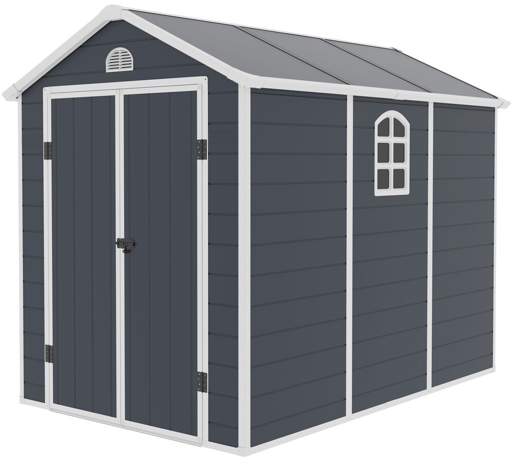 Záhradný domček AVE možno použiť na uskladnenie záhradného náradia, bicyklov, kosačiek, bazénového príslušenstva, dreva atď. Záhradný domček v modernom dizajne sa hodí do každej záhrady. Záhradný domček je vyrobený z kvalitného plastového materiálu - je ľahký a zároveň odolný. Plastové stĺpiky s hrúbkou materiálu 1,5 mm, vonkajšie plastové panely s hrúbkou 12 mm a kovové výstuhy zaručujú dostatočnú pevnosť. Okno zabezpečuje dostatočný prienik svetla do domčeka. Okno možno jednoducho umiestniť na pravú alebo ľavú stranu domu podľa vašich potrieb. Vetracia mriežka zabezpečuje vetranie a cirkuláciu vzduchu v dome. Domček je možné zabezpečiť visiacim zámkom. Súčasťou domčeka je konštrukčný rám, ktorý možno samozrejme ukotviť k podkladu. K domčeku je možné dokúpiť aj podlahovú konštrukciu. Maximálne zaťaženie strechy snehom je 60 kg/m2. Ochrana proti UV žiareniu a odolnosť voči poveternostným vplyvom. Jednoduchá montáž.