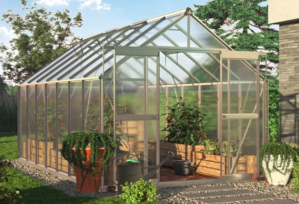 Strieborný polykarbonátový záhradný skleník Slide-In od značky Cultivo je priestranné a odolné riešenie pre všetkých, ktorí chcú pestovať zeleninu, ovocie, bylinky alebo kvety vo väčšom meradle. Moderný strieborný rám pôsobí elegantne a prirodzene zapadne do každej záhrady.