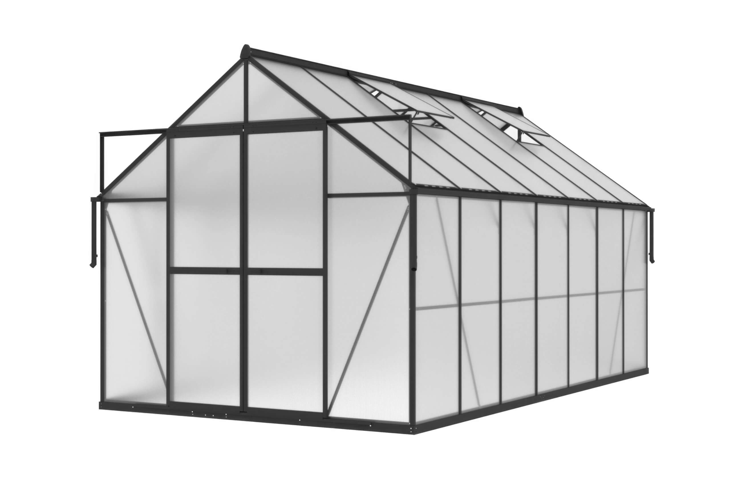 641.46 Čierny polykarbonátový skleník Cultivo Slide-In 244×429 cm je ideálnou voľbou pre všetkých pestovateľov, ktorí potrebujú veľký priestor, maximálnu stabilitu a rýchlu montáž bez komplikácií.