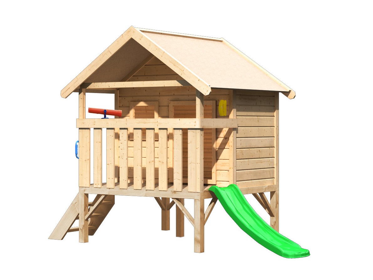 Náš najmenší a najobľúbenejší domček KARIBU MINI. Otecka poteší jednoduchou montážou a dieťa množstvom tvorivej slobody. Vďaka prefabrikovaným stenovým panelom zo smrekového dreva 14 mm a strechy z drevených dosiek so strešnou fóliou domček postavíte veľmi rýchlo. Štyri nohy 68 x 68 mm z prírodného smrekového dreva zaistí domčeku potrebnú stabilitu. Naše drevo pochádza zo vzdialeného severu Európy a je chemicky úplne neošetrené. V dôsledku toho je prosté všetkých známych problematických látok. Ihrisko je štandardne vybavené robustným dreveným rebríkom so 3 priečkami. Výška plošiny 60 cm je ideálna pre menšie deti. Otvory dverí a okien nie sú z bezpečnostných dôvodov uzavreté. Vďaka svojim rozmerom je domček KARIBU MINI vhodný predovšetkým pre menšie mestské záhrady.