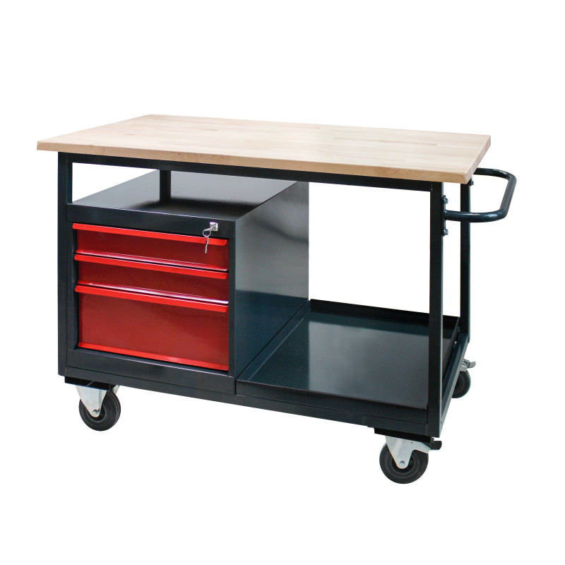 : DEMAPojazdný pracovný stôl s tromi zásuvkami s vysokou nosnosťou. Celokovové prevedenie, dve riadiace kolesá s brzdou a dve pevné kolesá, masívna buková pracovná doska. Tri zásuvky s plným vyťahovaním, z toho jedna veľká zásuvka, jedna odkladacia priehradka vrátane ochrany hrán.
