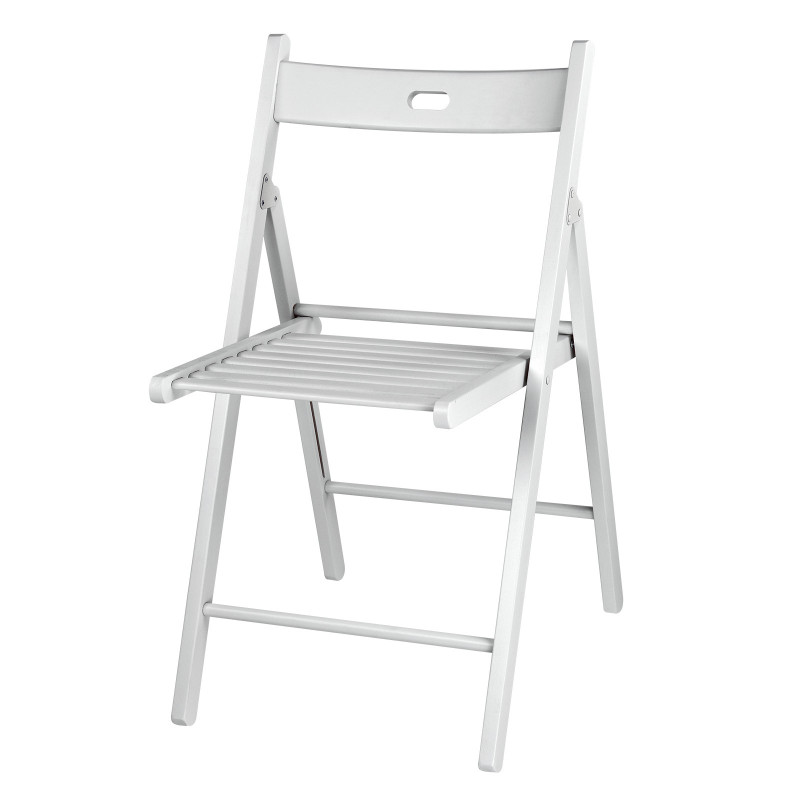 : DEMAĽahká drevená skladacia stolička z masívneho bukového dreva natretá bielou farbou. Jednoduché prenášanie alebo premiestnenie pri upratovaní vďaka praktickej rukoväti a úsporné uskladnenie vďaka malým rozmerom po zložení.