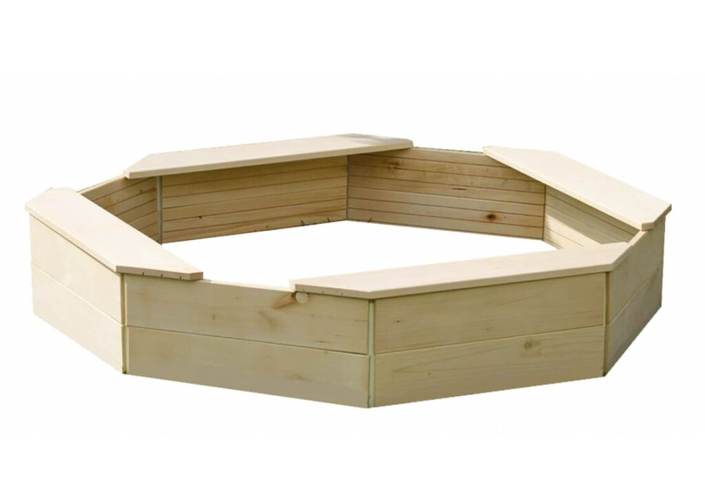 : MarimexDrevené osemhranné pieskovisko s rozmermi 130 x 130 x 26 cm.