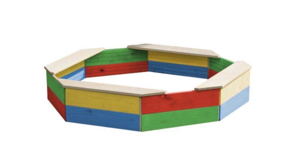 Drevené osemhranné pieskovisko s rozmermi 130 x 130 x 26 cm. Pieskovisko je vybavené 4 sedákmi na 4 stranách.