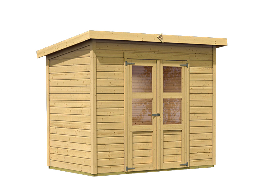 Základný model dreveného domčeka pre vašu záhradu. Tento model má sedlovú strechu a dvojkrídlové dvere na pántoch s oknom v každom krídle. Stavebným materiálom domčeku sú drevené profily hrúbky 14 mm perfektne vyfrézovane zo severského smreku. Dodávame ako stavebnicu v rozloženom stave, kde steny tvoria predpripravené menšie panely, ktoré iba zoskrutkujete k sebe a strechu tvorí celistvá doska. To garantuje extrémne jednoduchú montáž, ktorú zvládne každý domáci majster.