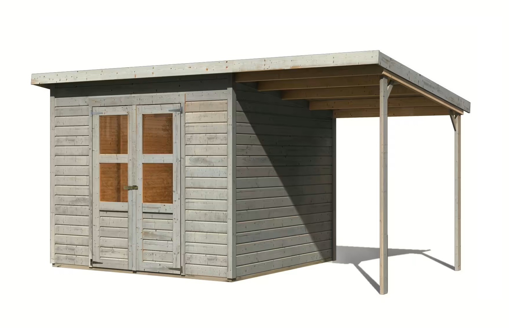 Drevený domček KARIBU MERSEBURG 6 + prístavok 166 cm (10248) svetlo sivý LG4441