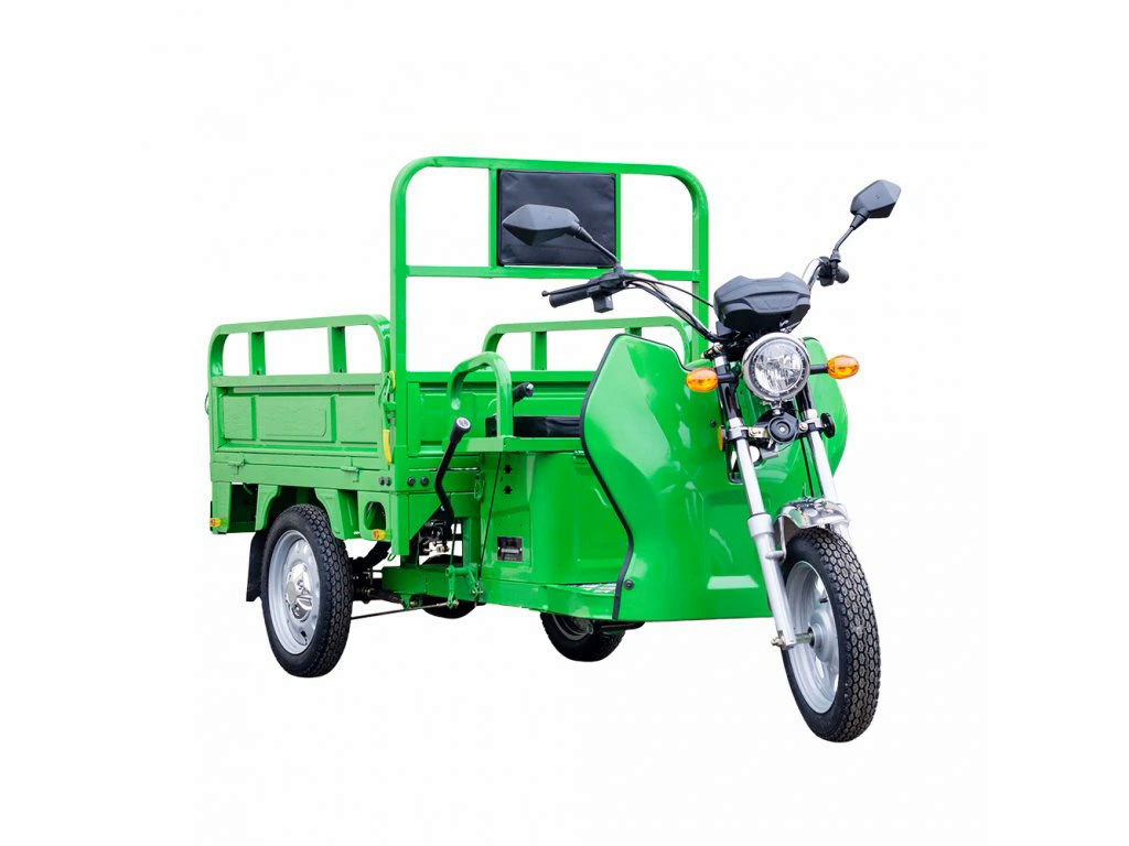Elektrická trojkolka/motorka s korbou, dojazd 60 km, maximálna rýchlosť 24 km/h, nosnosť 400 kg, brzdy bubnové, elektrický motor 48 V 850 W, napájanie 230 V, farba zelená.