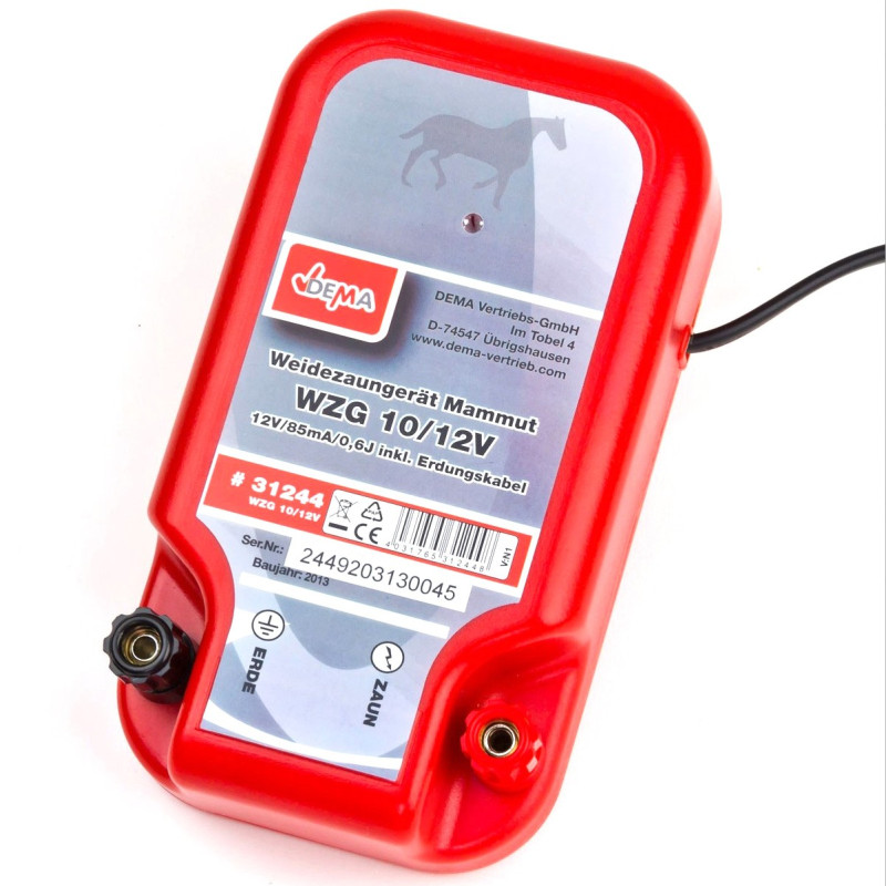 : DEMAElektrický ohradník pre poľnohospodárske zvieratá. Kompaktné rozmery, vysoký výkon, jednoduché pripojenie a údržba, možnosť zavesenia na stenu alebo stĺpik. Prípojný kábel autobatérie so svorkovým pripojením a prepojovací kábel pre zemný hrot a plot.