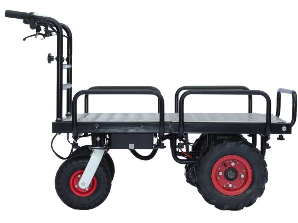 Elektrický plošinový vozík, výkon 350 W, ideálny na záhradu alebo do výroby. 13" predné kolesá, kotúčové brzdy, 2 rýchlostné režimy, jazda vpred/vzad. Možnosť manuálneho rozšírenia nákladnej plochy, nosnosť až 400 kg.