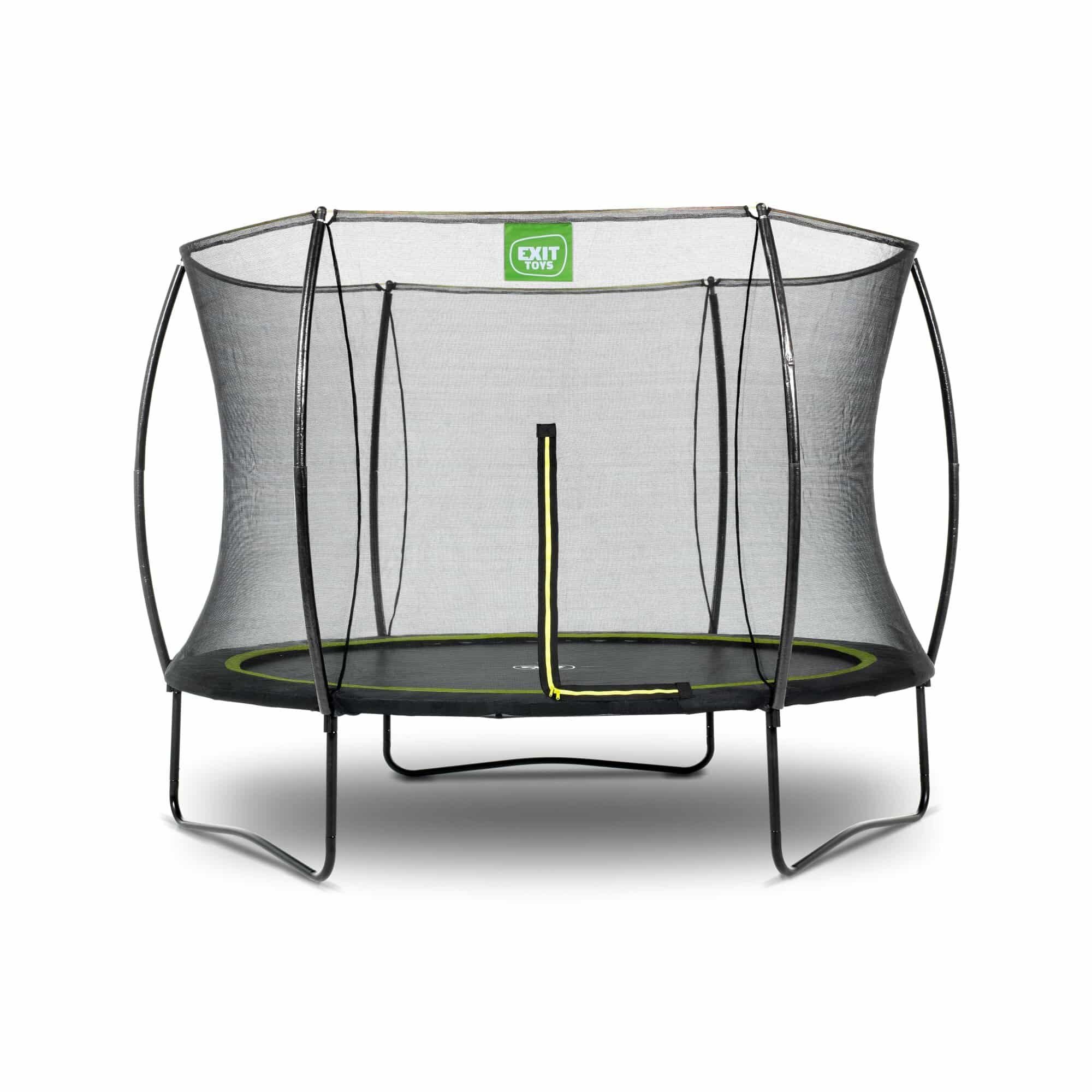 : EXIT TOYSTrampolína EXIT Silhouette na nohách je kompaktná, okrúhla trampolína s matným čiernym polstrovaním. Bezpečnostná sieť, ktorá sa štandardne dodáva s trampolínami na nohách, je vybavená zakrivenými stĺpikmi, ktoré udržia sieť napnutú. To je nielen extra bezpečné, pretože deti sa do siete nezachytia, ale aj na záhrade to vyzerá pokojnejšie. Ochranná sieť je vybavená dobre viditeľným, fluorescenčným zeleným zipsom, takže môžete priamo vidieť, či je zips správne zatvorený.