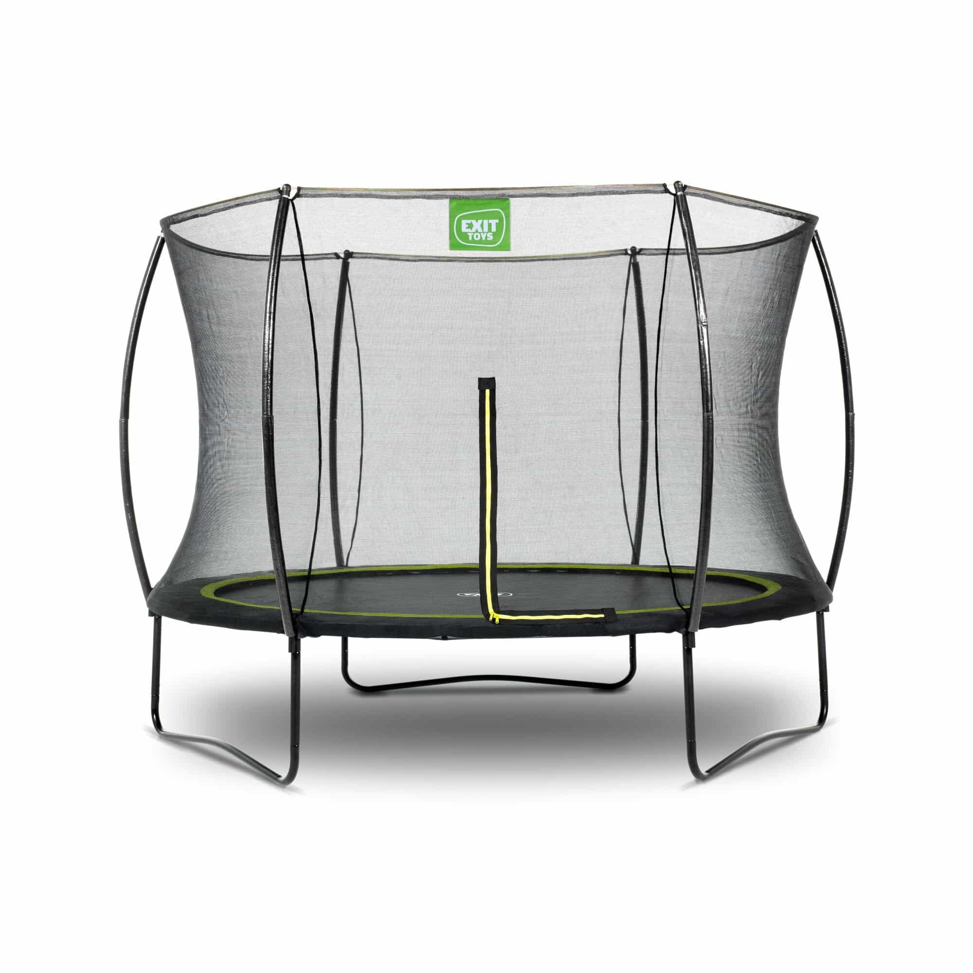 : EXIT TOYSTrampolína EXIT Silhouette na nohy je okrúhla trampolína s matným čiernym polstrovaním. Bezpečnostná sieť, ktorá sa štandardne dodáva s trampolínami na nohách, je vybavená zakrivenými stĺpikmi, ktoré udržia sieť napnutú. To je nielen extra bezpečné, pretože deti sa do siete nezachytia, ale aj na záhrade to vyzerá pokojnejšie. Ochranná sieť je vybavená pútavým, fluorescenčným zeleným zipsom, takže priamo vidíte, či je zips správne zatvorený.