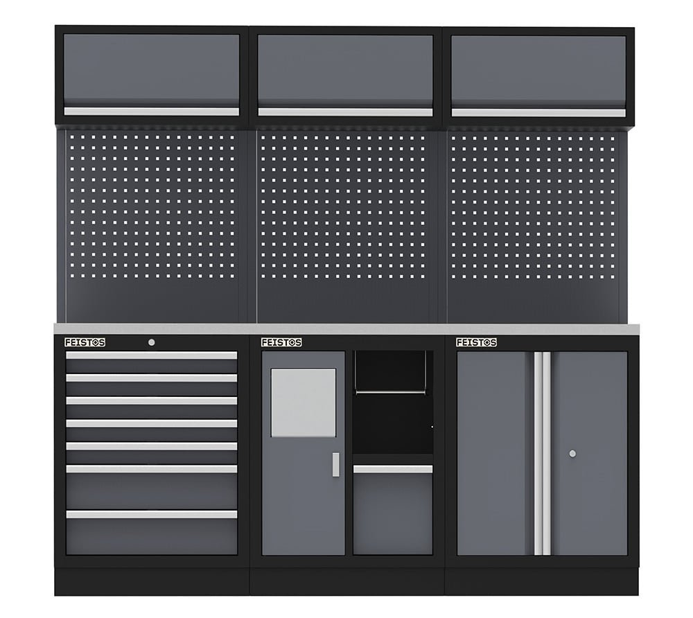 : FeistosŠtýl a úložný priestor pre dielňu s FEISTOS! Séria modulárnych skríň na náradie Apollo je nevyhnutnou výbavou pre hobby remeselníkov, profesionálnych montážnikov a kreatívnych domácich majstrov. Apollo boduje progresívnou farebnou kombináciou a dokonale zladenými detailmi: lesklé kovové lišty nahrádzajú štandardnú sadu úchytiek a šikovne tak vytvárajú moderný a funkčný akcent.