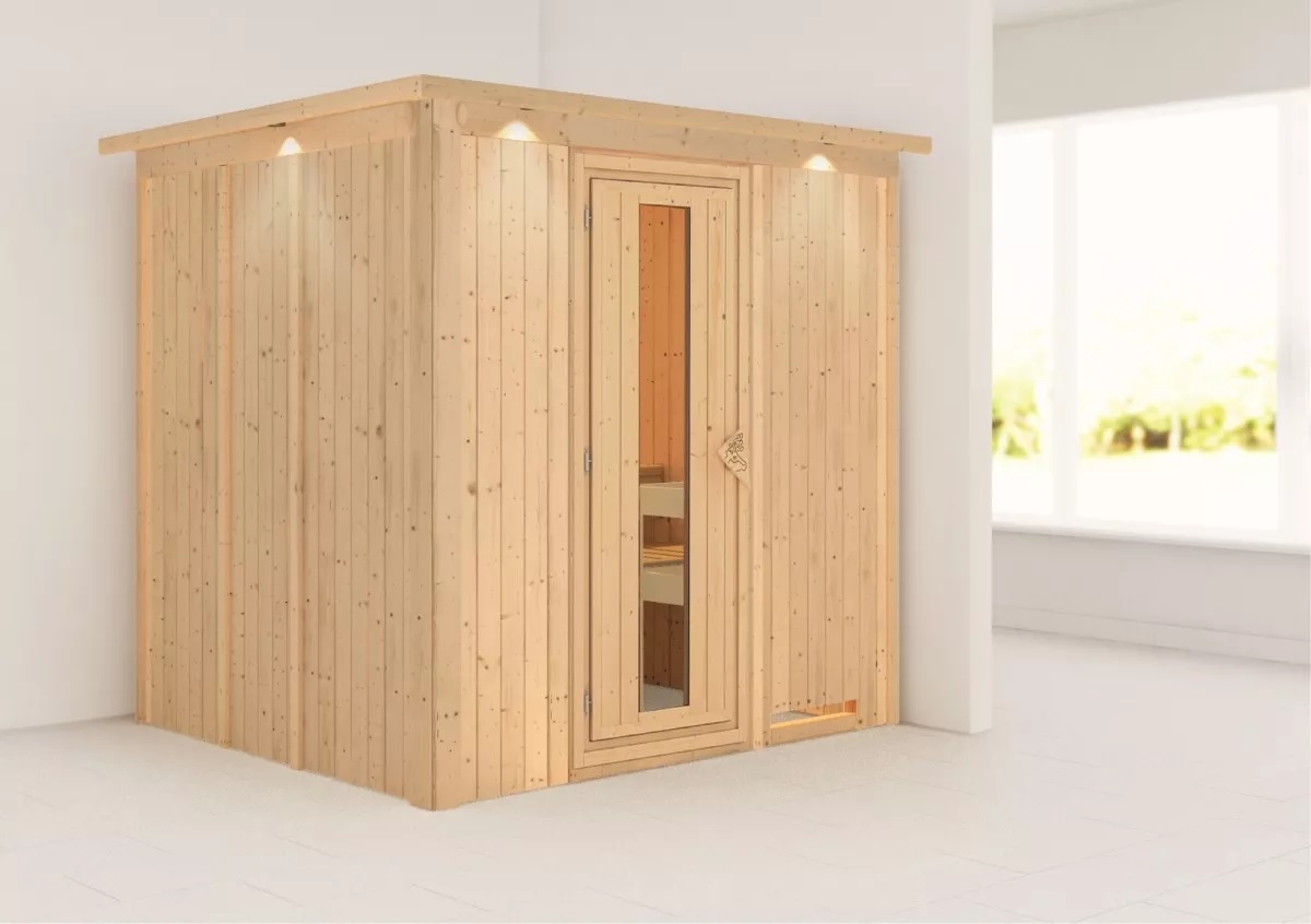 Fínska sauna určená pre dve ležiace osoby. Má obdĺžnikový tvar š 196 x h 170 x v 198 cm. Tento model fínskej sauny je určený do temperovaných interiérov domu alebo bytu. Jej výrobca, firma KARIBU HOLZTECHNIK z nemeckých Brém, dokázala svojimi výrobkami úspešne nadviazať na stáročnú tradíciu škandinávskeho saunovania a súčasne do nej zapracovať dnešné moderné technológie. Sauna je celá vyrobená z dreva severského smreka v prírodnom prevedení. Drevo pochádza zo vzdialeného severu Európy a je chemicky úplne neošetrené (nie je ani namorené ani nalakované). V dôsledku toho je prosté všetkých známych problematických látok, ktoré by sa v priebehu saunovania mohli z dreva uvoľňovať. Táto interiérová sauna vykazuje mimoriadne tepelno-izolačné vlastnosti. Steny sauny sú zložené z vnútornej a vonkajšej vrstvy špeciálne hladených dosiek s perom a drážkou, medzi ktorými je 42 mm hrubá tepelná izolácia v podobe minerálnej vlny. Celková hrúbka steny je tak 68 mm. Zadné alebo bočné nepohľadové strany orientované k stene miestnosti majú vonkajšiu stranu zo sololitu. Preto sú pri rovnakej tepelnej izolácii o cca 10 mm tenšie ako pohľadové strany pokryté palubovkami.
