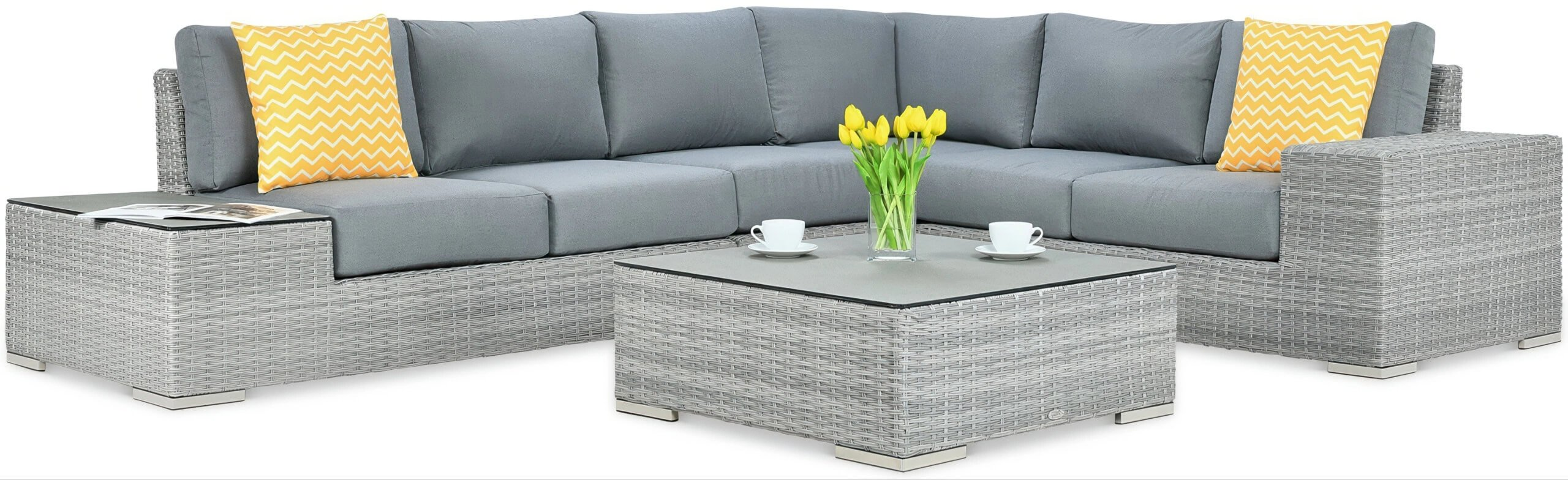 Štýlová a praktická rohová pohovka Avocado prináša dokonalú kombináciu elegancie a funkčnosti do vašej záhrady, na terasu alebo do moderného interiéru. Sada pozostáva zo štyroch modulov s pohodlnými vankúšmi a konferenčného stolíka s doskou z tvrdeného skla, ktorá dopĺňa praktickosť celej súpravy.