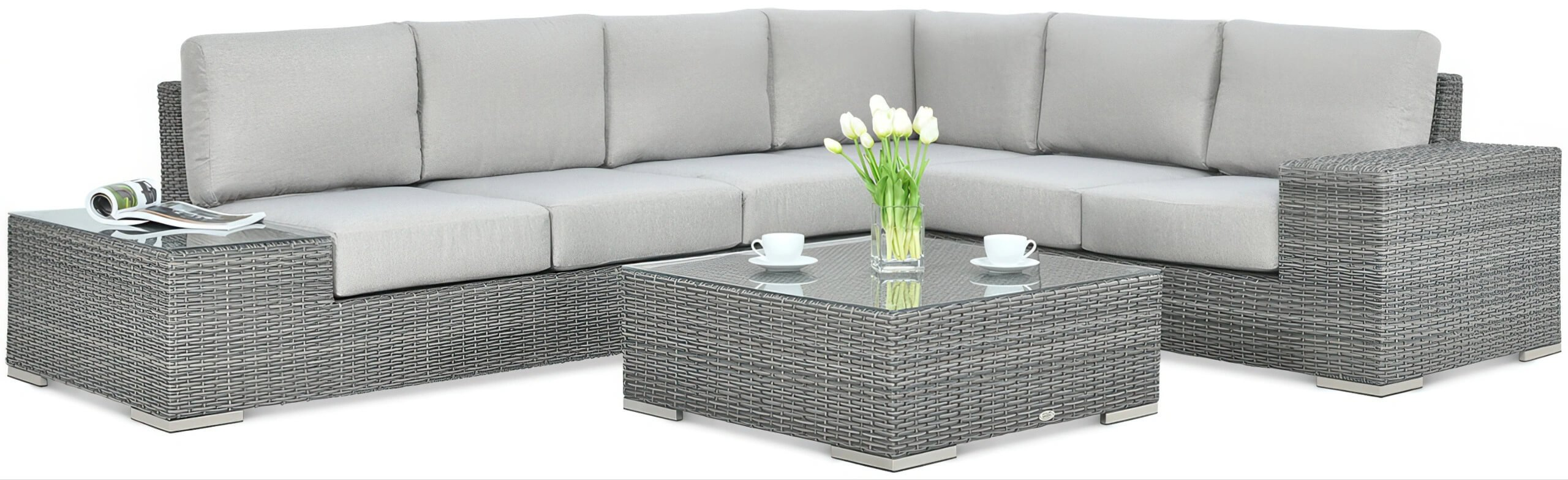 Štýlová a praktická rohová pohovka Avocado prináša dokonalú kombináciu elegancie a funkčnosti do vašej záhrady, na terasu alebo do moderného interiéru. Sada pozostáva zo štyroch modulov s pohodlnými vankúšmi a konferenčného stolíka s doskou z tvrdeného skla, ktorá dopĺňa praktickosť celej súpravy.