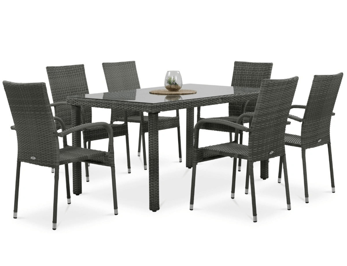 356.91 Jedálenská súprava FIESTA/VENECJA 6+1 je štýlové, praktické a trvácne riešenie pre každého, kto hľadá elegantný nábytok s dlhou životnosťou. Táto súprava pre 6 osôb spája moderný dizajn s vysokou funkčnosťou a je vyrobená z technoratanu, ktorý je známy svojou odolnosťou voči poveternostným vplyvom, UV žiareniu a vlhkosti.
