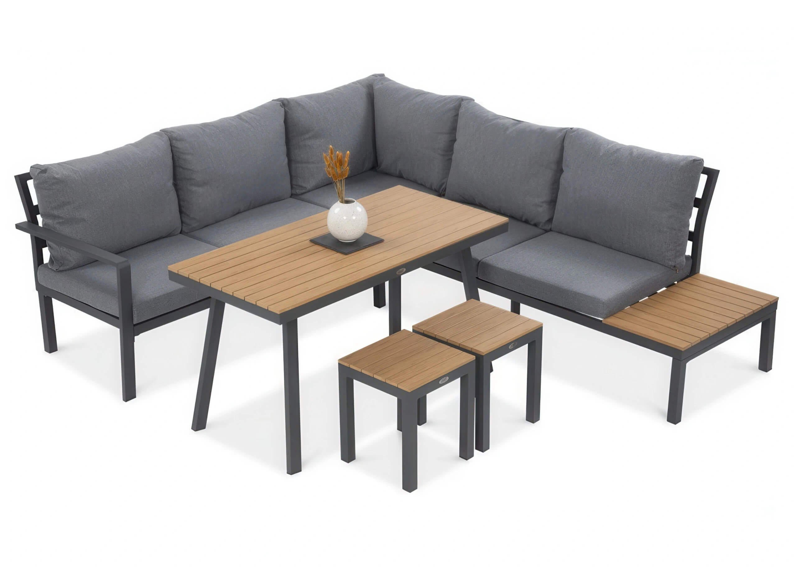 Objavte dokonalú harmóniu pohodlia, elegancie a odolnosti s rohovou pohovkou HAMILTON DINING s tmavosivými pufmi. Táto exkluzívna súprava je navrhnutá tak, aby premenila vašu záhradu alebo terasu na oázu relaxu. Hliníkový rám zaisťuje ľahkosť a dlhú životnosť, zatiaľ čo Polywood použitý na stole a poličke dodáva nábytku jedinečný charakter a odolnosť voči poveternostným vplyvom. Pohodlné vankúše z polyesterovej látky a 10 cm peny zabezpečia komfort pri každom posedení.