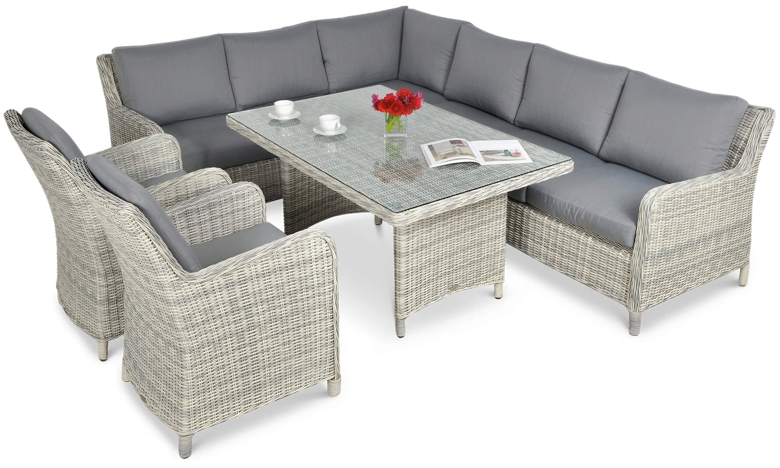 1543.90 Rohová sedacia súprava Maryland bielo sivá z kvalitného technoratanu predstavuje nadčasové riešenie, ktoré spája praktickosť, estetiku a maximálne pohodlie. Sada pozostáva z dvoch hlavných modulov, dvoch komfortných kresiel a veľkého jedálenského stola – všetko v harmonickom hnedom prevedení, ktoré pôsobí prirodzene a luxusne.