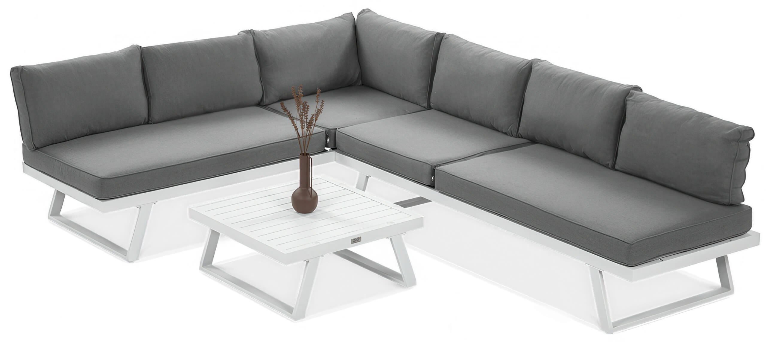 Rohová súprava pozostáva z troch modulov – dvoch rohových pohoviek a jedného stredového dielu, ktorý môžete využiť aj ako ležadlo alebo chaiselongue. Každý modul je vyrobený z kvalitných materiálov odolných voči poveternostným vplyvom vrátane UV žiarenia. Robustný práškovo lakovaný hliníkový rám zaisťuje dlhú životnosť a vysokú odolnosť voči korózii.