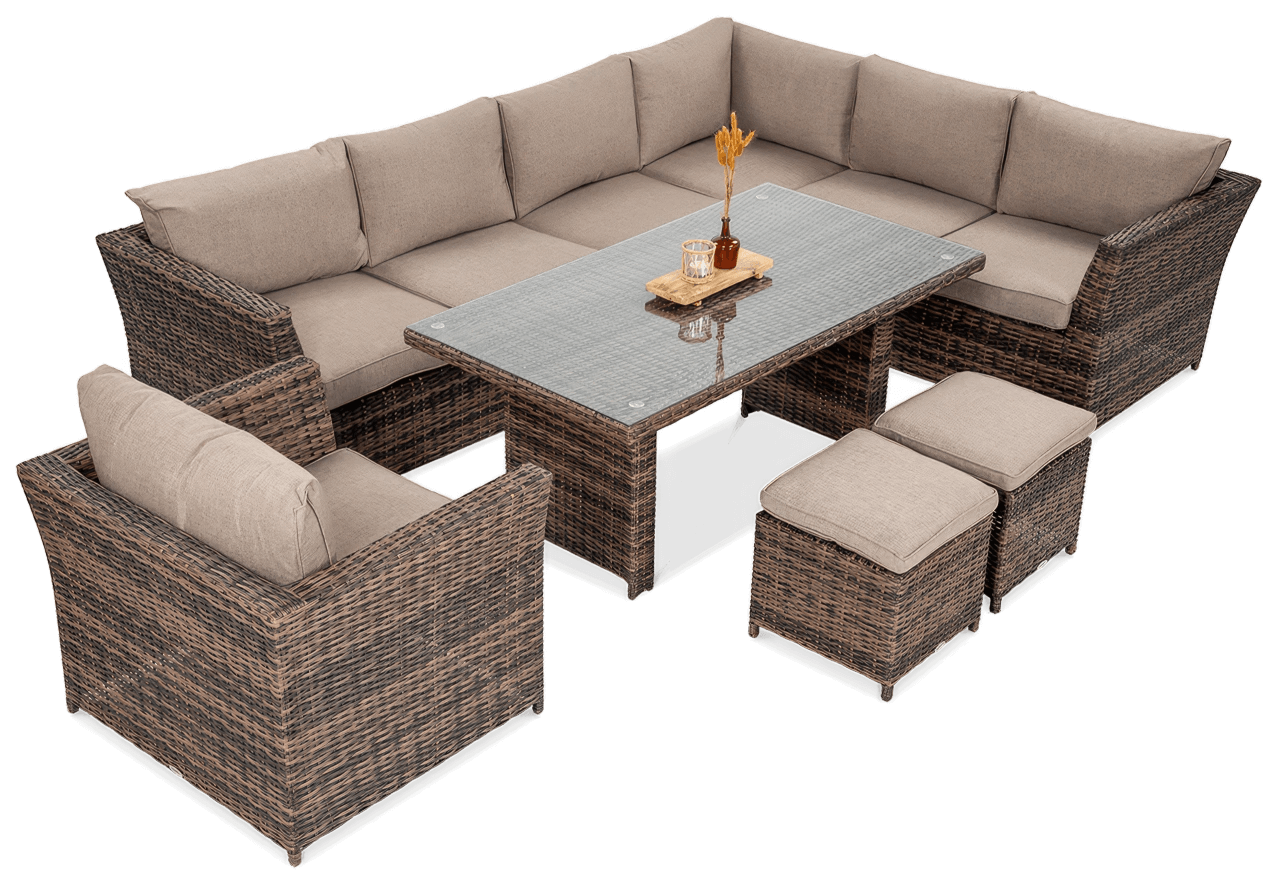 Užite si pohodlie a štýl vonku aj vo vnútri s exkluzívnou záhradnou súpravou Moniz Dining Plus. Táto modulárna sada obsahuje všetko potrebné pre príjemný relax – dvojdielnu rohovú pohovku Moniz z ratanu, dve taburetky, pohodlné kreslo a veľký jedálenský stôl s doskou z tvrdeného skla, ktorý pohodlne pojme až 8–9 osôb.