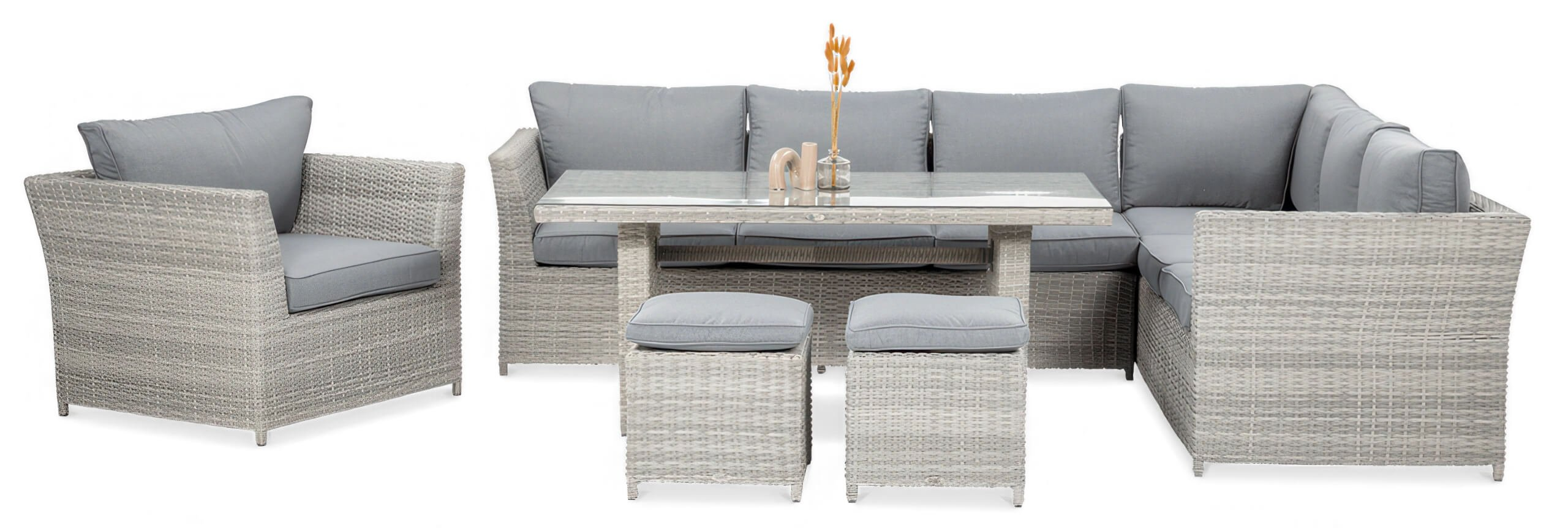 Užite si pohodlie a štýl vonku aj vo vnútri s exkluzívnou záhradnou súpravou Moniz Dining Plus. Táto modulárna sada obsahuje všetko potrebné pre príjemný relax – dvojdielnu rohovú pohovku Moniz z ratanu, dve taburetky, pohodlné kreslo a veľký jedálenský stôl s doskou z tvrdeného skla, ktorý pohodlne pojme až 8–9 osôb.