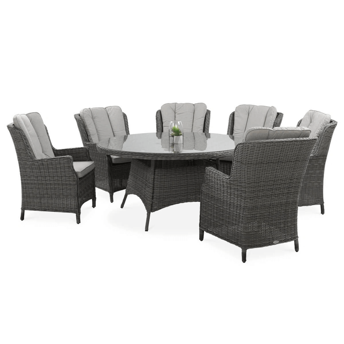 1421.95 Technoratanová súprava Ravena DARK GREY predstavuje spojenie luxusu, pohodlia a odolnosti v súčasnom záhradnom nábytku. Súprava obsahuje 6 pohodlných kresiel a veľký okrúhly stôl, ktoré spoločne vytvárajú elegantný a funkčný relaxačný priestor.