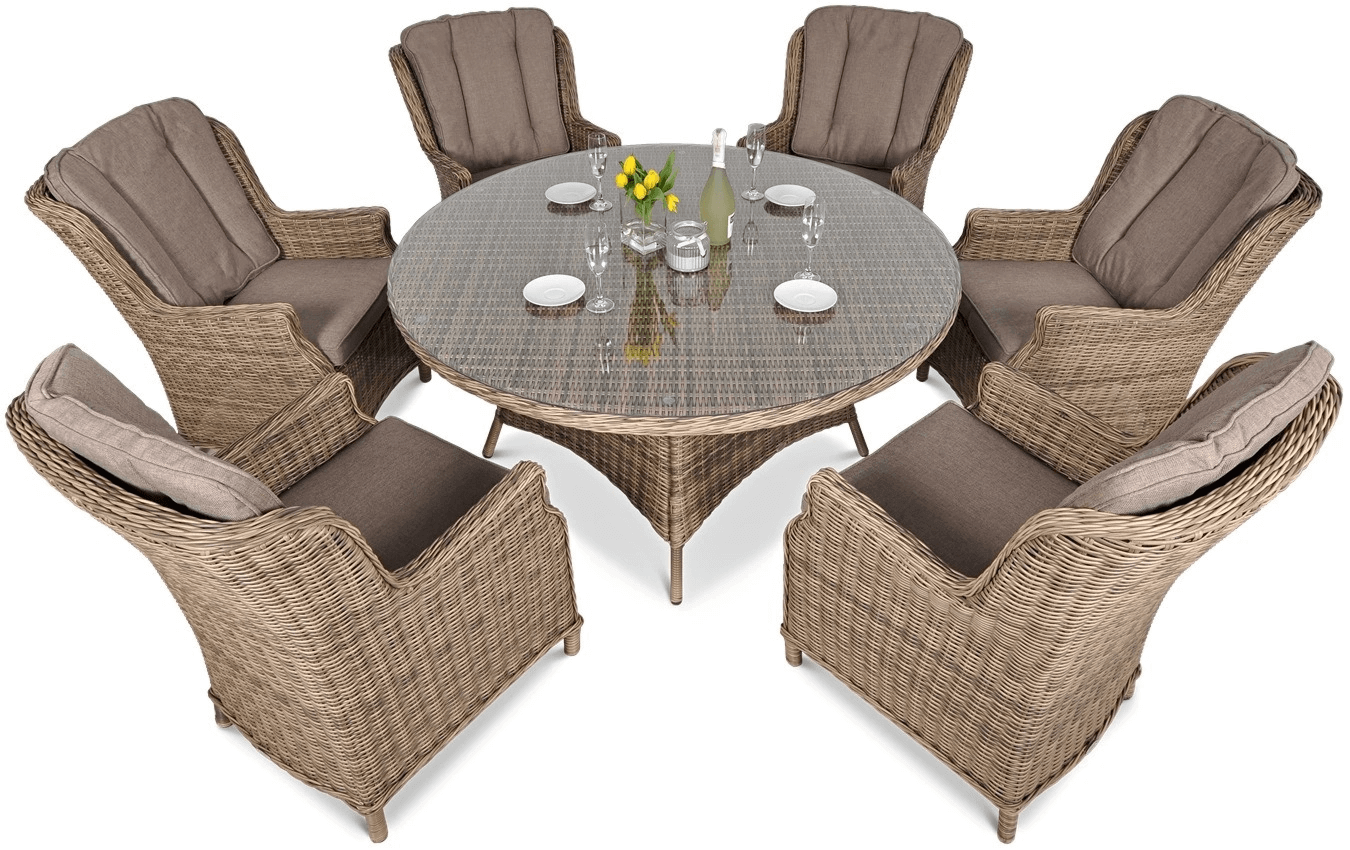 1421.95 Technoratanová súprava Ravena Brown predstavuje spojenie luxusu, pohodlia a odolnosti v súčasnom záhradnom nábytku. Súprava obsahuje 6 pohodlných kresiel a veľký okrúhly stôl, ktoré spoločne vytvárajú elegantný a funkčný relaxačný priestor.