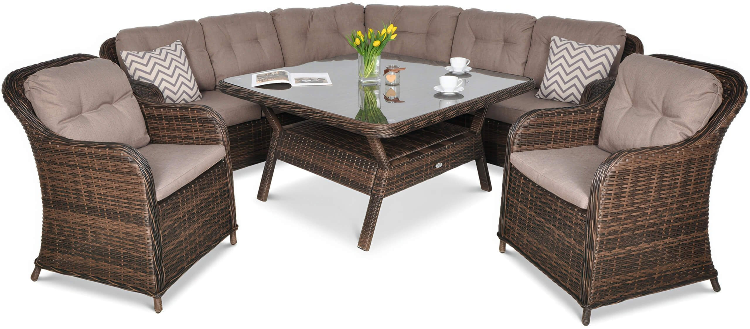 1543.90 Doprajte si dokonalý komfort a štýlový vzhľad vo vašej záhrade alebo na terase s modulárnou rohovou pohovkou Savona Brown. Táto elegantná sada záhradného nábytku pozostáva zo šiestich prvkov – troch spojiteľných pohoviek, dvoch samostatných kresiel a veľkého stola s pevnou doskou z tvrdeného skla a praktickou policou.