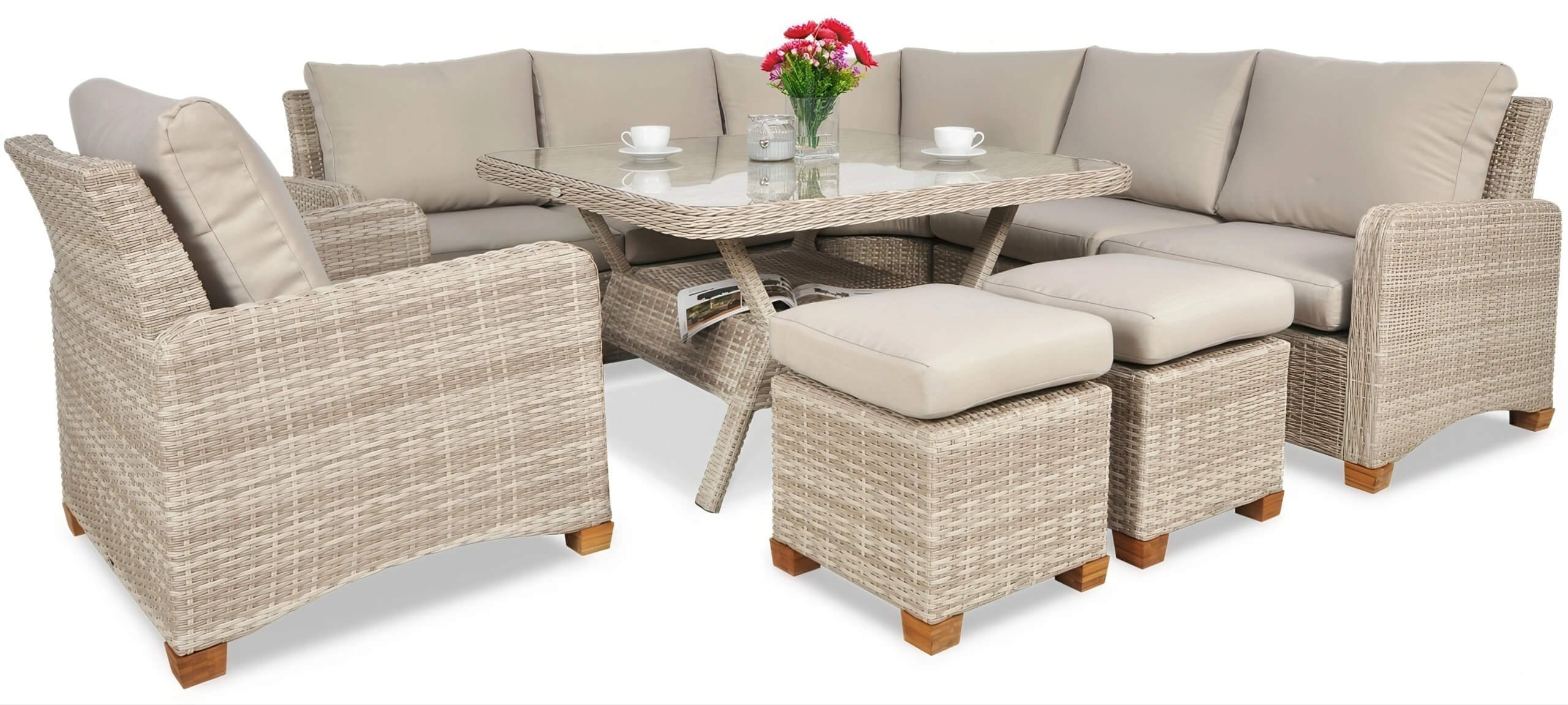 1706.50 Rohová pohovka Toledo Dining béžová predstavuje spojenie nadčasového dizajnu, luxusného pohodlia a vysokej odolnosti. Táto elegantná sada záhradného nábytku z kvalitného technoratanu je skvelou voľbou aj pre náročných zákazníkov, ktorí hľadajú štýlové riešenie pre svoju terasu, záhradu alebo interiér.