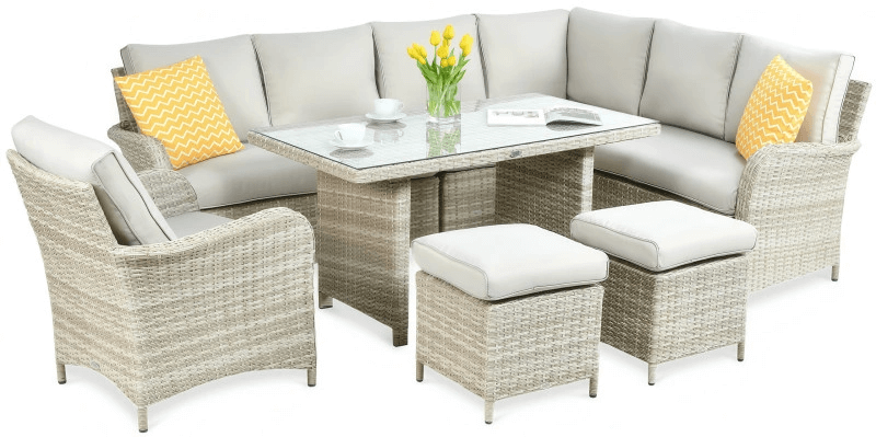 1056.10 Rohová pohovka Ventura Grand beige je elegantná a priestranná záhradná súprava, ktorá okamžite vytvorí útulné miesto na relax vo vašej záhrade, na terase či verande. Kombinuje prírodný vzhľad kvalitného syntetického ratanu s pevnosťou hliníkového rámu, vďaka čomu je nielen štýlová, ale aj mimoriadne odolná a stabilná.