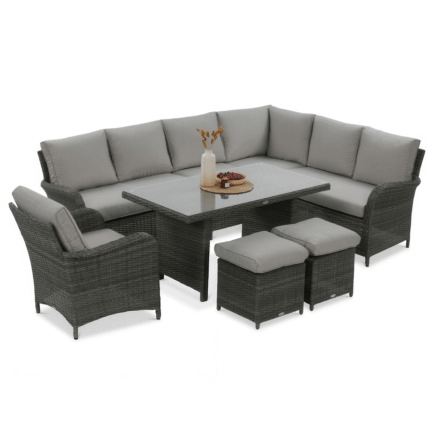 1056.10 Rohová pohovka Ventura Grand je elegantná a priestranná záhradná súprava, ktorá okamžite vytvorí útulné miesto na relax vo vašej záhrade, na terase či verande. Kombinuje prírodný vzhľad kvalitného syntetického ratanu s pevnosťou hliníkového rámu, vďaka čomu je nielen štýlová, ale aj mimoriadne odolná a stabilná.