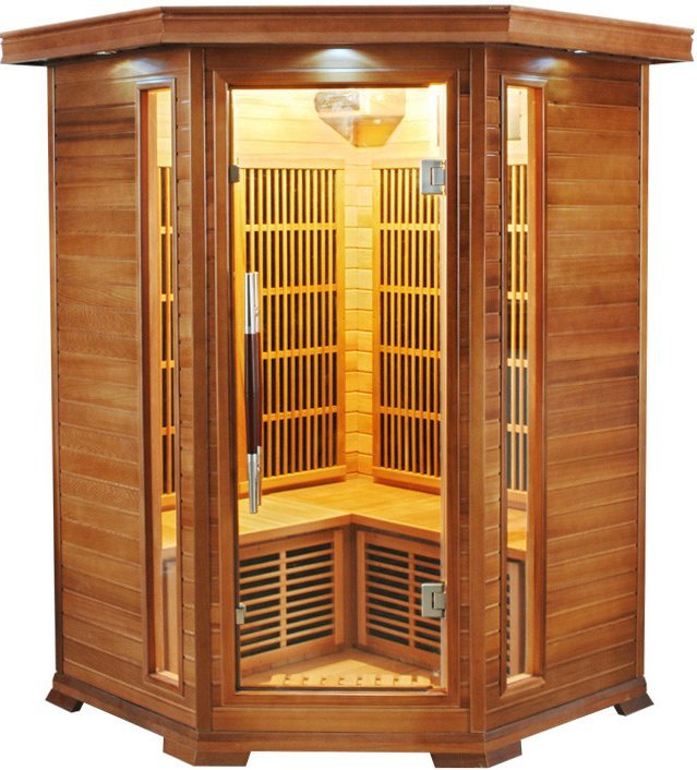 : France SaunaRohová infrasauna pre 3 osoby vyrobená zo 100 % kanadského červeného cédra, ktorý udržiava krásu domácej infrasauny mnoho rokov. Karbónové infražiariče, bezpečnostné sklenné dvere a ozónový generátor.