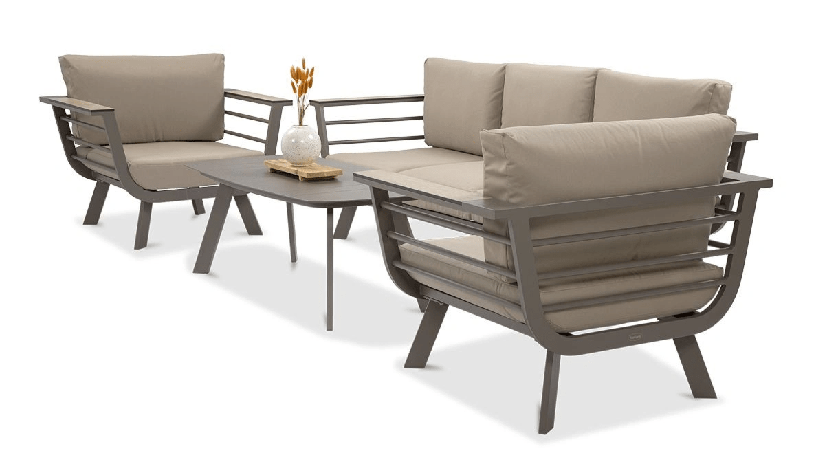 Vytvorte si v záhrade útulné a elegantné posedenie so súpravou záhradného nábytku Aspen Caffe v neutrálnych sivých a taupe odtieňoch a užívajte si príjemné chvíle relaxu s rodinou, priateľmi alebo osamote s knihou a osviežujúcim nápojom. Táto súprava vniesie do vašej záhrady moderný a nadčasový nádych, pričom je zároveň praktická a pohodlná.