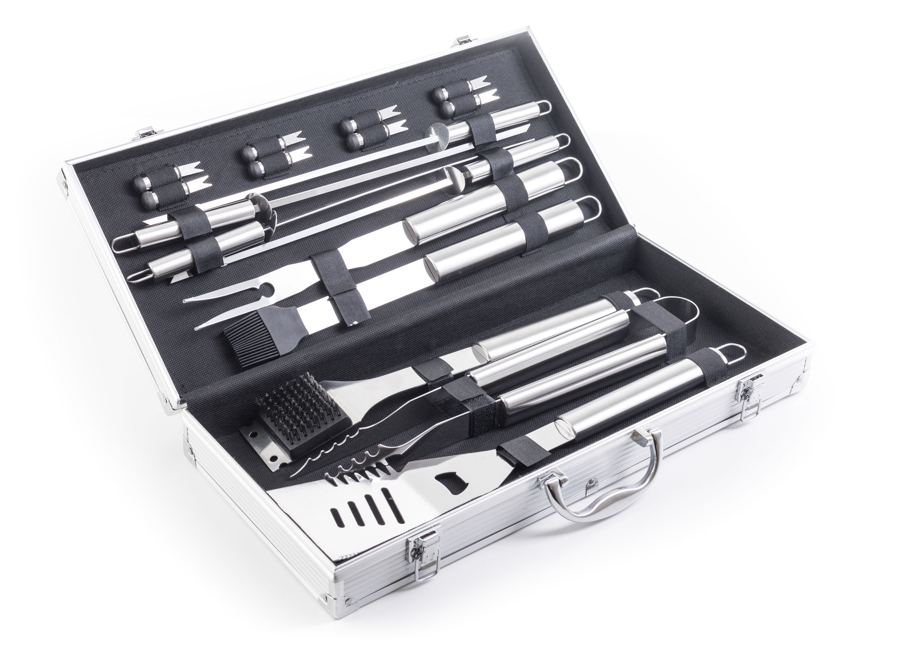 31.63 G21 grilovacie náradie v kufríku obsahuje obracačku, vidličku, grilovacie kliešte, štetec na potieranie, kefu na gril, napichovadlá a ihly na špízy. Odolný hliník. kufrík zaistí jednoduché a bezpečné prenášanie a skladovanie gril. náčinia s dĺžkou 45 cm.