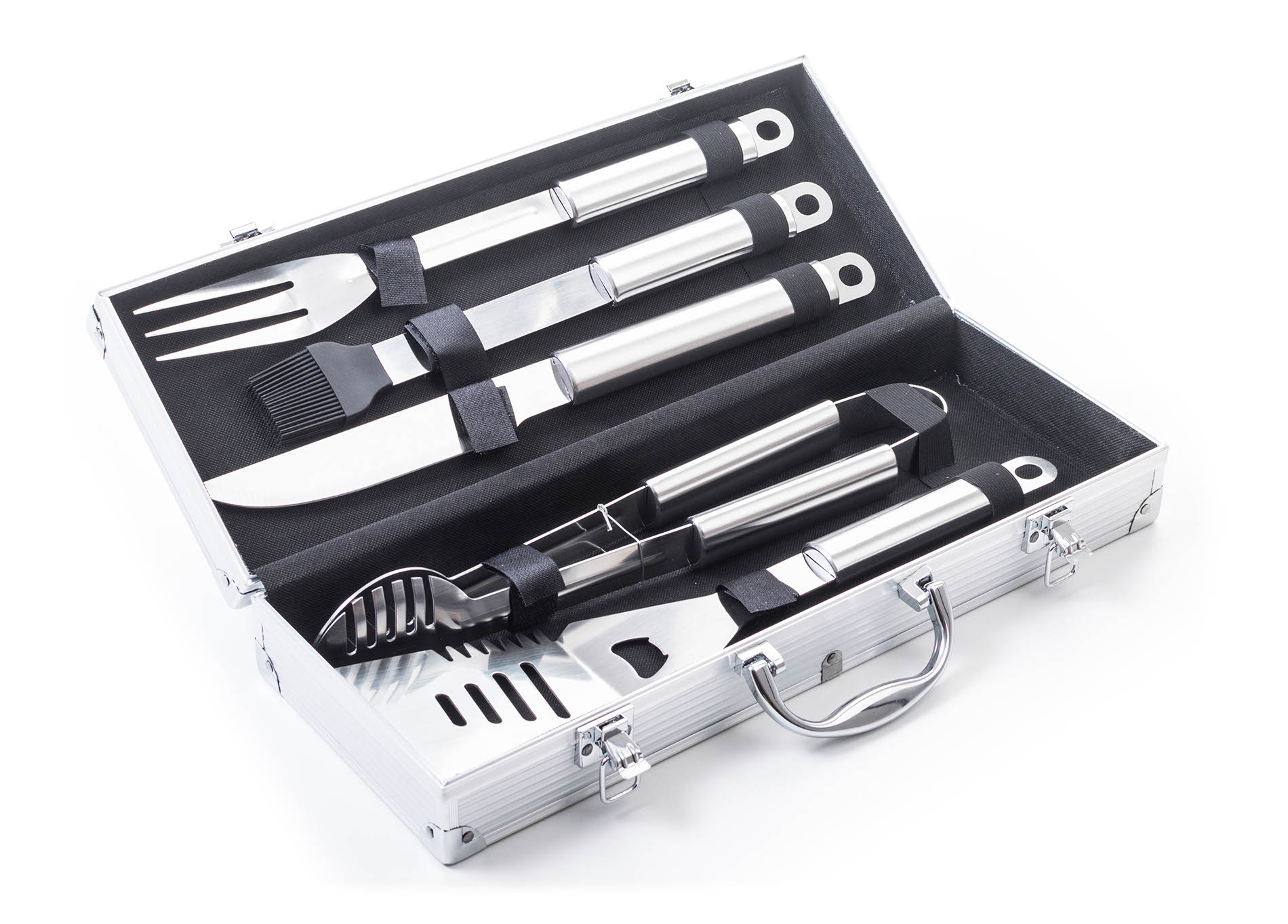 G21 grilovacie náradie v kufríku obsahuje obracačku, vidličku, grilovacie kliešte, predĺžený grilovací nôž a štetec na potieranie. Odolný hliníkový kufrík zaistí jednoduché a bezpečné prenášanie a skladovanie grilovacieho náčinia s dĺžkou 40 cm.