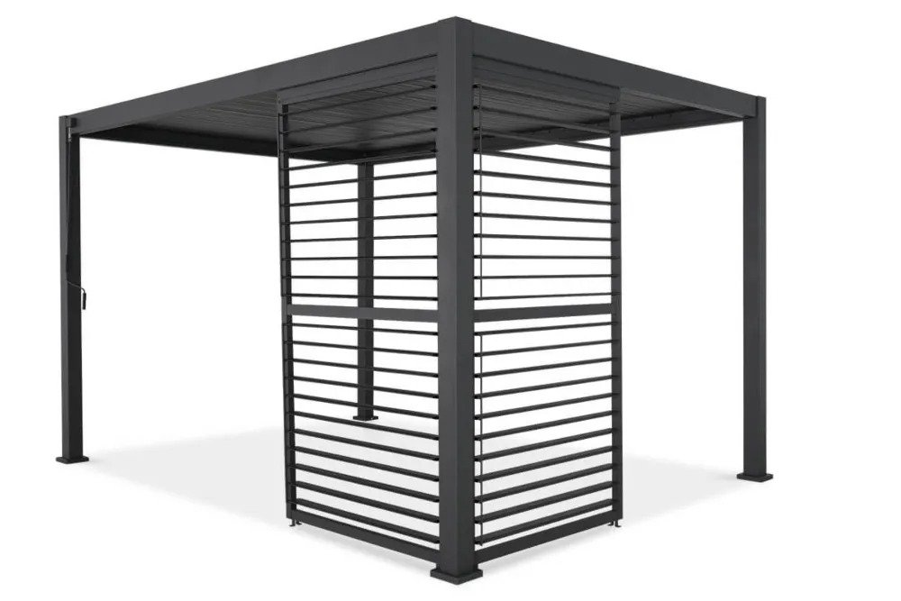 Nastaviteľný lamelový panel Premium 93 cm od spoločnosti Gutroof je praktickým a estetickým doplnkom pergol zo série Premium 3. Vyrobený z odolného antracitového hliníka poskytuje účinnú ochranu pred slnkom, vetrom a dažďom a zároveň zvyšuje úroveň súkromia.