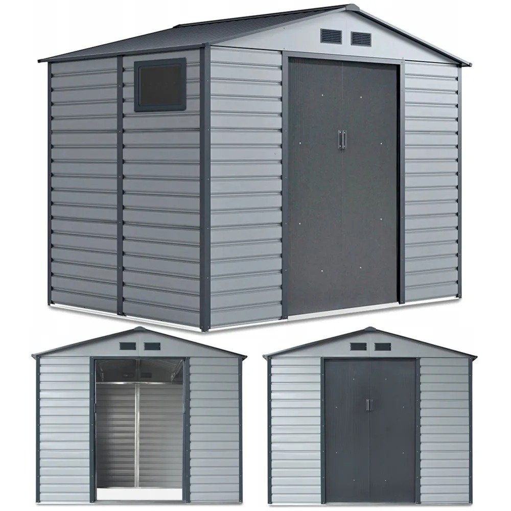 405.69 Záhradný domček MONTREAL je praktické a štýlové riešenie na uskladnenie záhradného náradia, bicyklov či iného vybavenia. Jeho pevná konštrukcia z pozinkovanej ocele a panely z žiarovo pozinkovaného plechu (hrúbka 0,25 mm) zabezpečujú dlhú životnosť, vysokú odolnosť voči korózii a nepriaznivým poveternostným podmienkam.