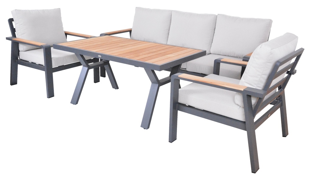 : RojaplastLuxusná hliníková súprava v grafitovej povrchovej úprave s podrúčkami a doskou stola z teakového dreva. Moderná súprava, ktorá sa dokonale hodí do každého exteriéru alebo interiéru.