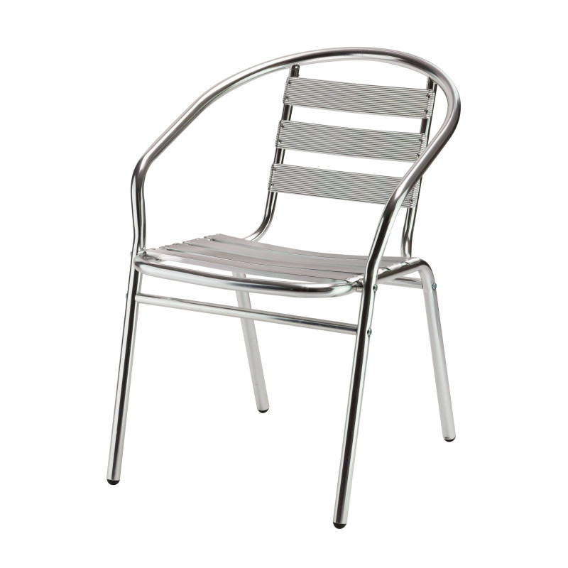 : DEMAĽahká a pohodlná stolička z lešteného hliníka. Stohovateľná, odolná voči vode, jednoduchá údržba. Skrutkované hlavné spoje, nitované prvky sedadla a operadla. Na nohách PVC podlahové chrániče.