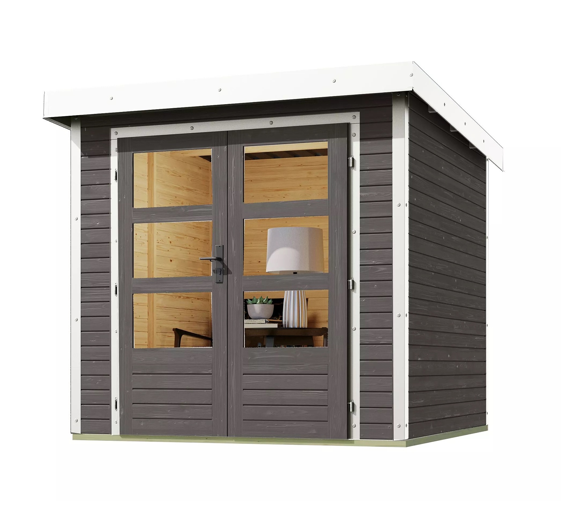 Tento model domčeka dodávame v profesionálnom nátere KARIBU (odtieň terragrau RAL 0604005):