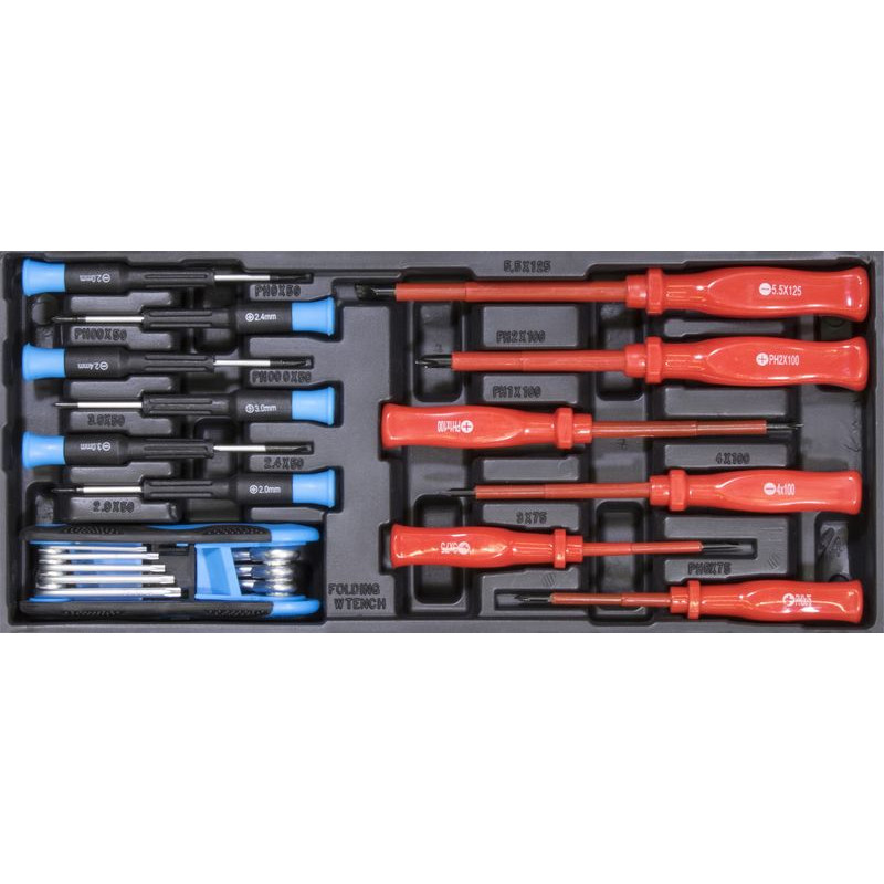 : GüdeIzolované skrutkovače ploché 3*75, 4*100, 5*125 mm, izolované skrutkovače krížové 0*75, 1*100, 2*100 mm, viaczubé kľúče, skrutkovače na jemnú mechaniku krížové 0,1,2 / ploché 1,2,3, v plastovej vložke do zásuvky.