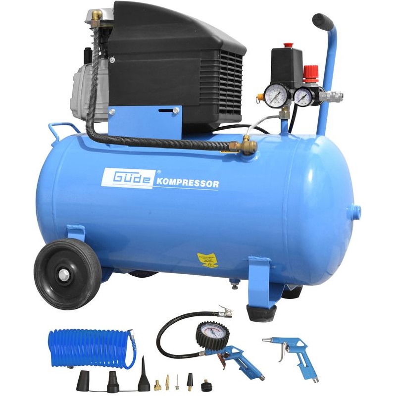 : GüdeJednovalcový kompresor s olejovým mazaním, s priamym pohonom. Manometer tlaku v nádobe a manometer pracovného tlaku, 2 spojky na stlačený vzduch, redukčný ventil, poistný ventil, vypúšťací ventil na kondenzát. Dvojitá noha s gumovým nárazníkom, plastové kolesá, prepravná rukoväť.