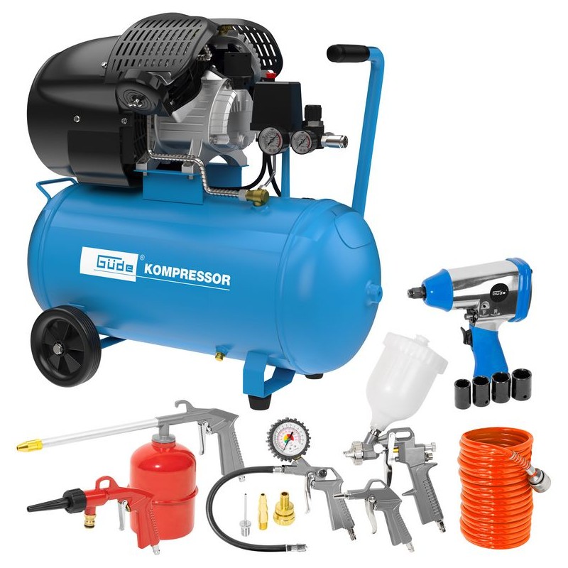 : GüdeDvojvalcový V-agregát s olejovým mazaním, s priamym pohonom. Tlakový spínač, manometer tlaku v nádobe a manometer pracovného tlaku, 2 spojky na stlačený vzduch, redukčný ventil pracovného tlaku, poistný ventil, spätný ventil, vypúšťací ventil na kondenzát, vzduchový filter.