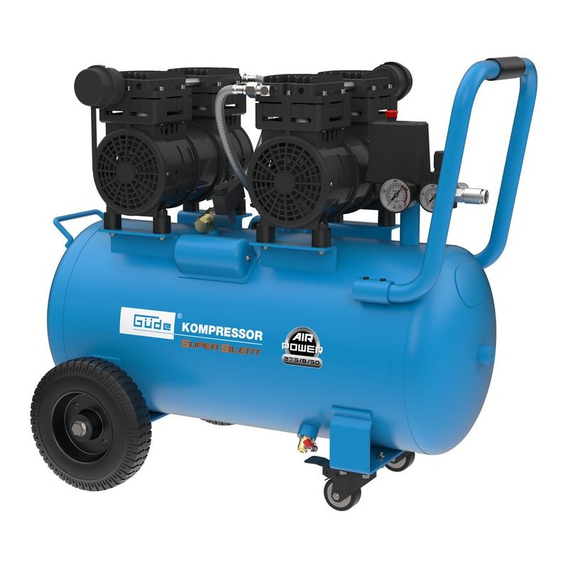 : GüdeBezolejový štvorvalcový piestový kompresor, 2 dvojpiestové agregáty so samostatným motorom, 4 vzduchové filtre, 2 prepínacie relé pre oneskorený štart, mechanický tlakový spínač, manometer na meranie tlaku v nádobe a pracovného tlaku. 50-litrová nádrž, rukoväť na prenášanie a riadiace kolieska.