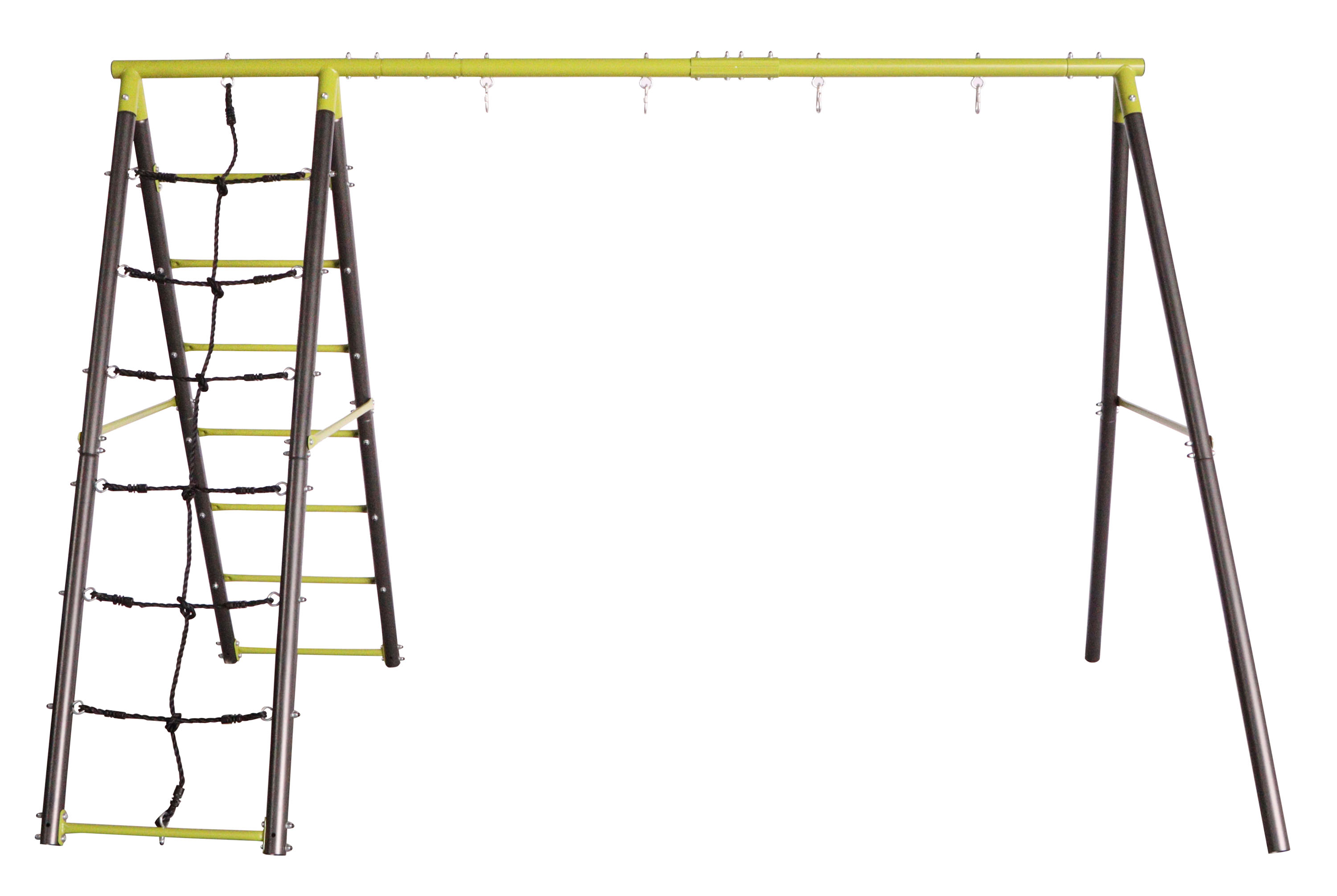 Stabilný kovový rám s rebríkom a lezeckou sieťou na zavesenie záhradných hojdačiek a hojdacieho kruhu. Rozmery 283 x 184 x 180 cm, kotviace prvky a oká na zavesenie hojdačiek sú súčasťou balenia.